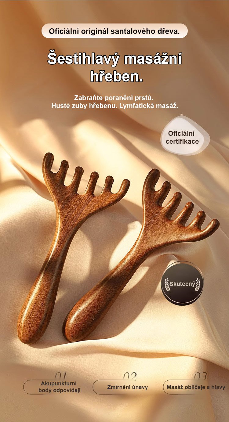 Zlatý hedvábný santalový dřevěný masážní hřeben meridián se šesti drápy